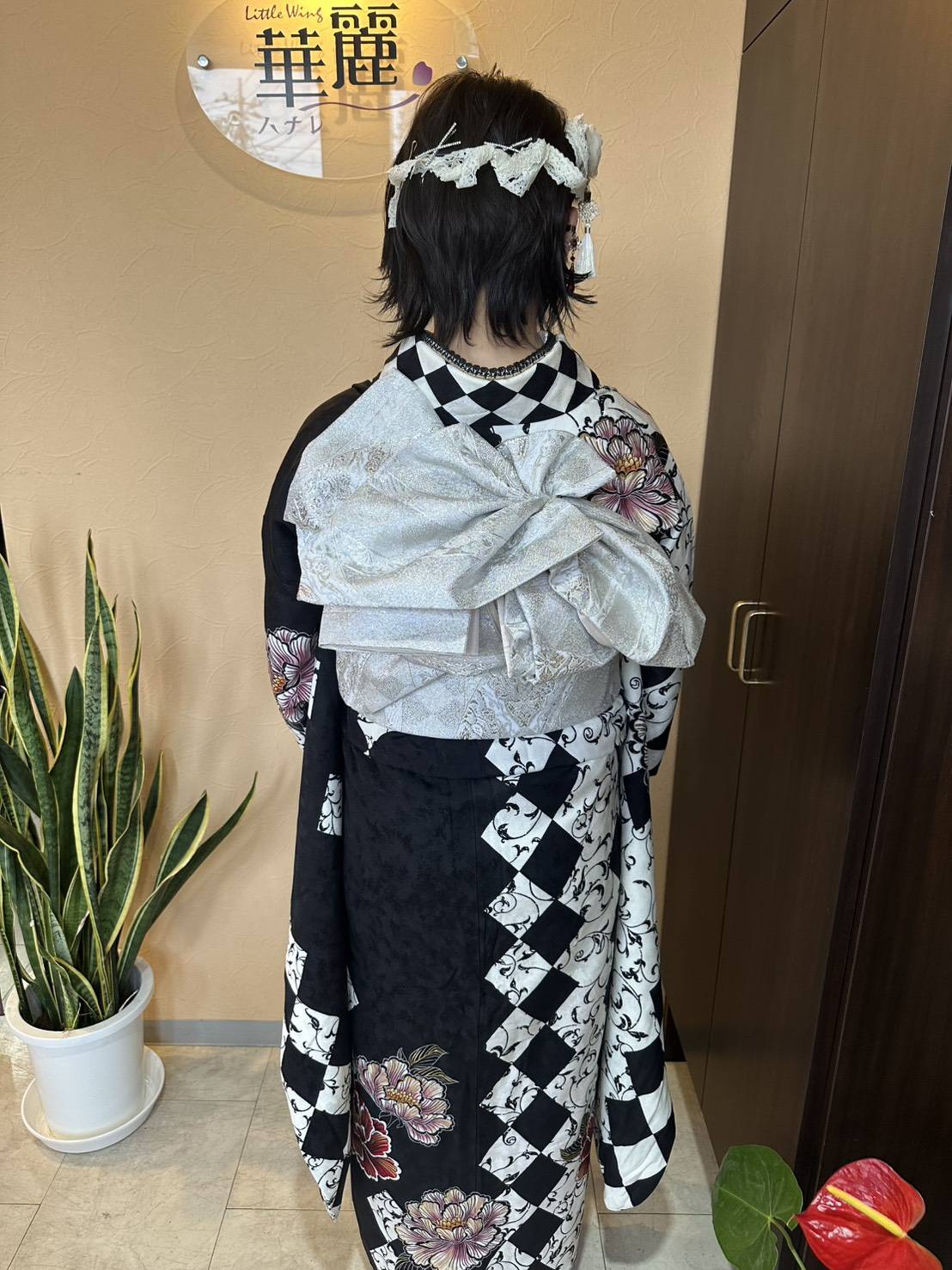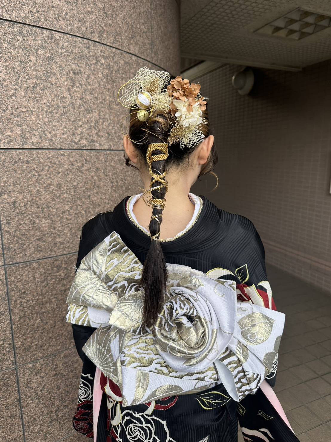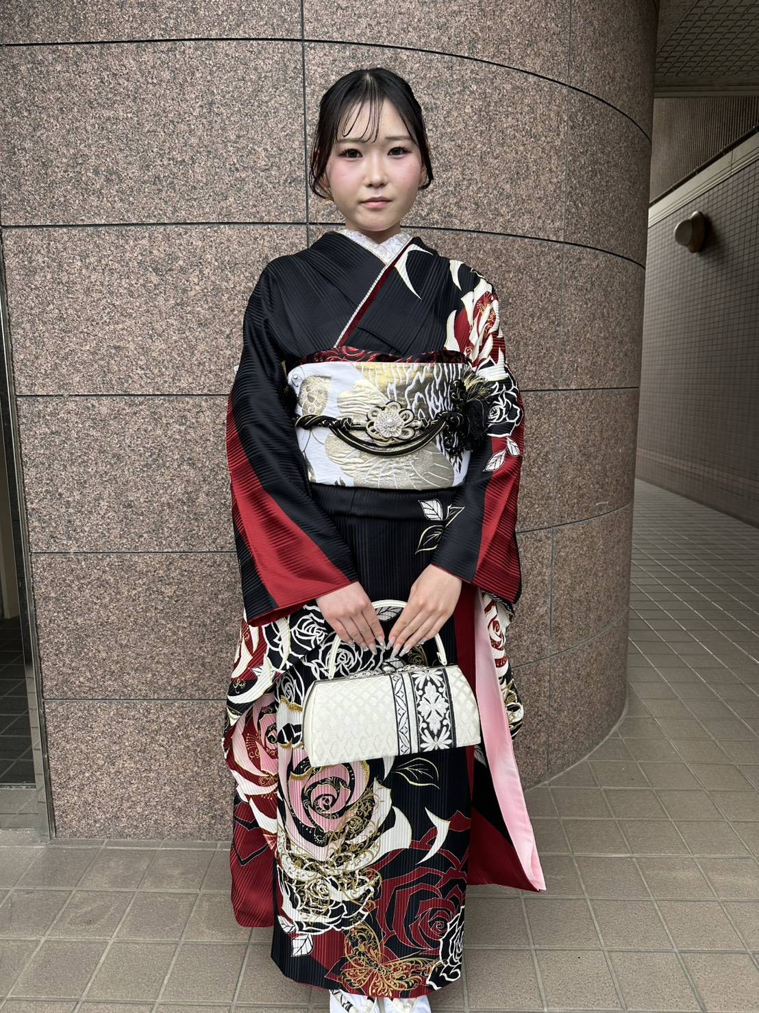 薔薇のお振袖に合わせて帯結びも薔薇にしてみました